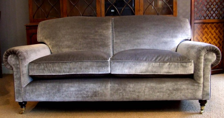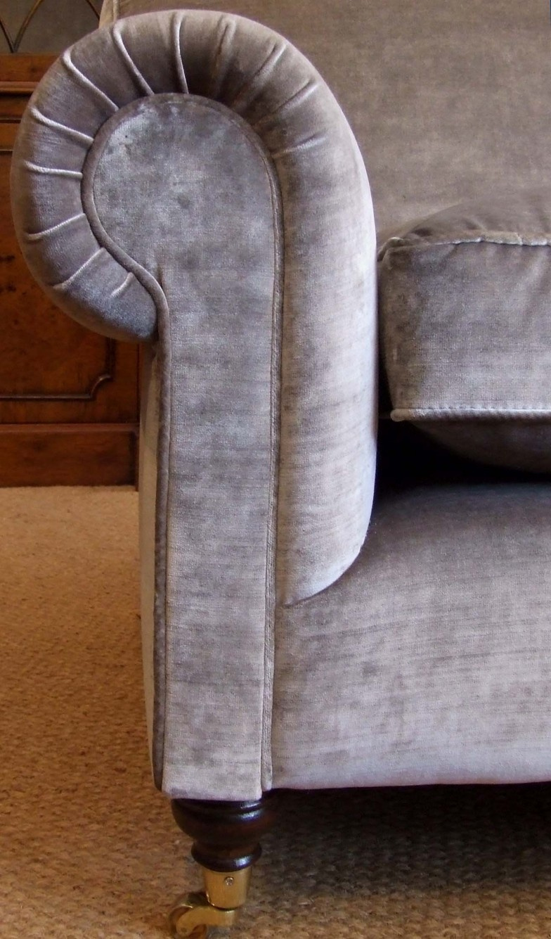 Softest of soft velvet, 2 1/2 seater Lansdown (total length 6ft1"/1.85m). A laid back sofa, maintaining a classic appearance, with full scroll arms (immaculately piped) and soft feather and down cushions, plumped up on a fully sprung base, seat height 47cm.